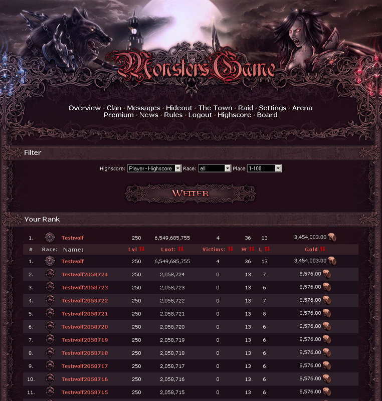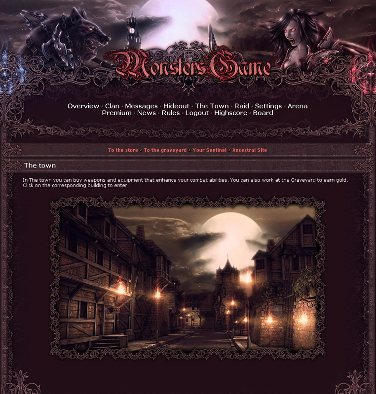 Vous n'avez besoin de rien de plus qu'une connexion Internet et un navigateur pour jouer à MonstersGame. Cliquez sur « S'inscrire » et décidez si vous voulez joindre le clan des vampires ou de celui des loups-garous. L'enregistrement est très simple, ne vous coûte rien et il n'y a aucun autre engagement sur votre part. Une fois que vous vous êtes enregistré, vous vous trouvez à la page de vue d'ensemble de votre personnage RPG. C'est là que vous pouvez trouver des informations importantes sur votre personnage et également votre lien de morsure, avec lequel vous pouvez faire de nouvelles des victimes, loin de votre atteinte sur Internet, en plaçant le lien de façon appropriée. Par exemple, vous pouvez envoyer le lien à vos amis, le placer sur votre page perso ou l'employer comme signature dans les forum. Si une victime clique sur votre lien, vous le ou la mordez et sucez 1-3 litres de sang (en tant que vampire) ou dévorez 1-3 kilogrammes de chair (comme loup-garou). En plus, la même quantité d'or sera créditée sur votre compte de jeu. Si votre victime s'inscrit à MonstersGame, vous avez créé un nouveau vampire/loup-garou et vous recevez 25% du butin que il/elle reçoit de ses propres victimes via l'Internet ! Une fois que le personnage(s) que vous avez créé par l'intermédiaire de votre lien de morsure a atteint le niveau 3, vous recevez 50 pièces d'or et 1 point d'expérience ! Vous pouvez investir votre or dans la formation pour que votre personnage, afin d'améliorer ses compétences ou vous pouvez acheter et augmenter votre Repaire pour mieux vous protéger contre les attaques de vos ennemies.