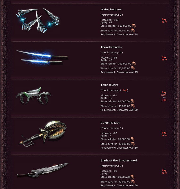 Le lien "Premium" vous mène là où vous pouvez acheter des Cristaux de sang. Dans le temple du sang, tu pourras utiliser tes Cristaux de sang pour avoir un compte Premium ou les échanger contre de l'or à un taux dépendant de ton niveau. Les Cristaux de sang peuvent aussi êtres utilisés à l'échoppe pour acheter des amulettes ou améliorer ton arme sur la page Statut (ou sur la page Inventaire si tu l'utilise)... Temple du sang